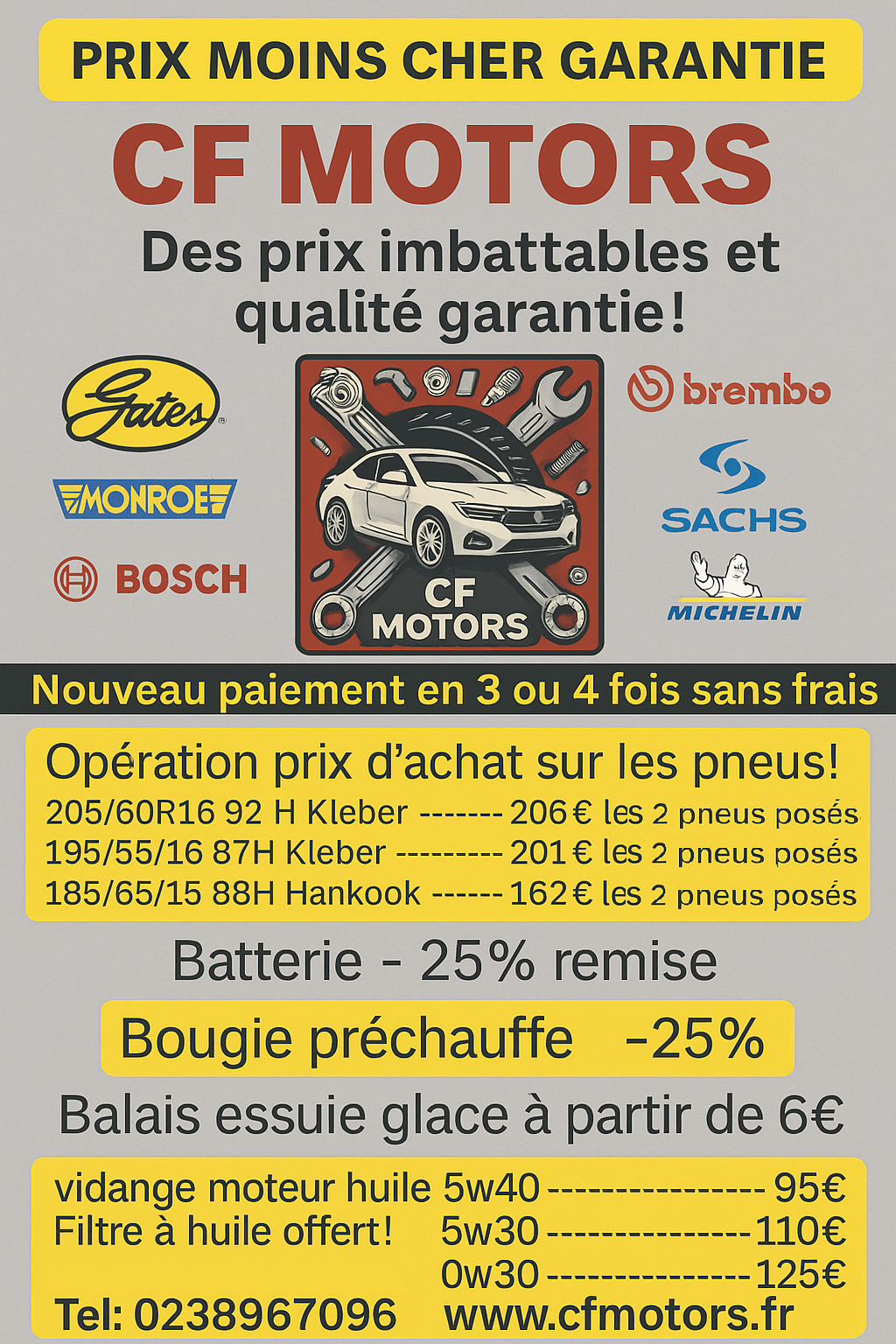 Bienvenue chez CF MOTORS, votre garage de confiance situé au 17 bis rue de la Chapelle, ZA Les Michaux, 45220 Saint-Germain-des-Prés. Notre équipe de mécaniciens expérimentés vous accueille dans un atelier moderne, entièrement équipé pour tous travaux de mécanique et de carrosserie.